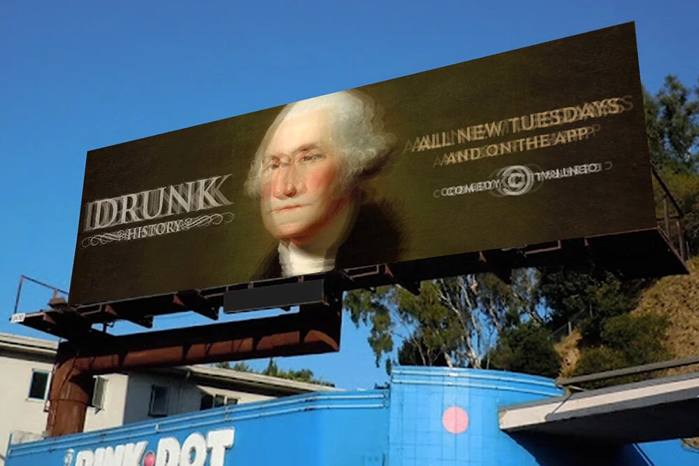 For season 2, we really wanted to engage new viewers and make them curious to find out what Drunk History is really about. I wanted to make them feel a little tipsy and give them a taste of whats to come. I came up with this idea and hand painted all logos and Comedy branding to make the entire piece feel like a real work of art.